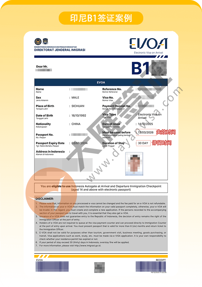 印尼B1旅游签1工快速出签!