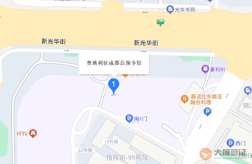 奥地利共和国驻成都总领事馆(Consulate General of the Republic of Austria in Chengdu)位于中华人民共和国四川省成都市锦江区人民南路2段1号仁恒置地广场27楼04, 05单元。