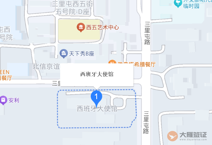 西班牙驻北京大使馆位于北京市朝阳区三里屯路9号,领区:北京 天津 河北 山西 辽宁 吉林 黑龙江 山东 河南 湖北 西藏 陕西 甘肃 青海 宁夏 新疆