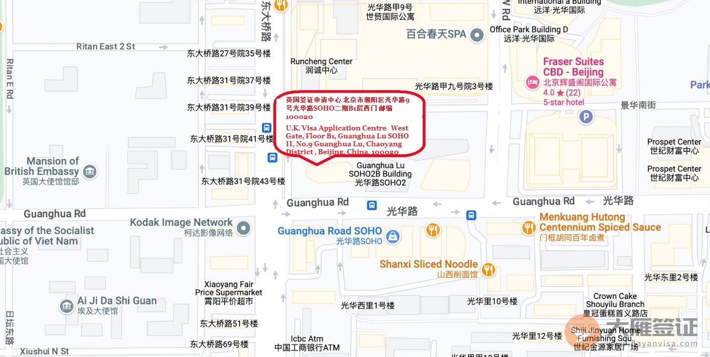 北京英国签证申请中心位于北京市朝阳区光华路9号光华路SOHO二期B1层西门,将助力中国公民赴英旅游、留学和工作等,为申请人提供更多便利。