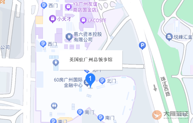 英国驻广州总领事馆位于广州市珠江新城珠江西路5号广州国际金融中心22层,主要负责华南六省(广东、广西、福建、海南、湖南、江西)的领事事务,包括促进双边关系、贸易投资、教育文化合作等,但不直接处理签证业务。