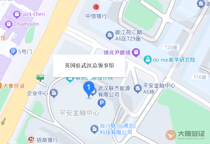 英国驻武汉总领事馆位于湖北省武汉市江岸区中山大道1628号平安金融大厦33层,2015年1月启动业务,2016年1月正式开馆,领区覆盖湖北、河南两省,主要职责涵盖政务、经贸、教育、文化等领域。