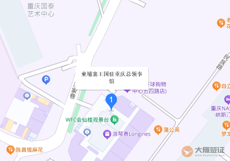 柬埔寨王国驻重庆总领事馆(Consulate General of the Kingdom of Cambodia in Chongqing)位于中华人民共和国重庆市渝中区民族路188号环球金融中心29楼。