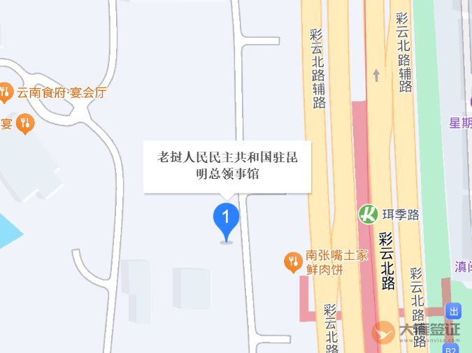 老挝人民民主共和国驻昆明总领事馆(Consulate General of Lao People's Democratic Republic in Kunming)位于中华人民共和国云南省昆明市彩云北路6800号。,主要办理老挝签证的领事管辖区域为云南。属于以上领区的中国公民,如需办理老挝签证,可以前往老挝驻昆明总领事馆办理。
