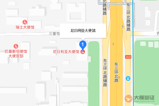 地铁10号线(外环)农业展览馆站(A西北口出)下车步行950米到达尼日利亚大使馆