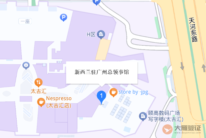 新西兰驻广州总领事馆位于广东省广州市天河区天河路385号太古汇一座3006室,管辖领区为广东、广西、福建、海南、湖南。