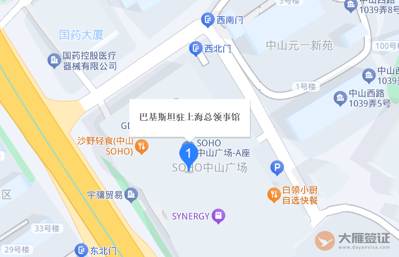 巴基斯坦驻上海总领事馆位于繁华的虹桥开发区,毗邻日本、韩国和新加坡总领馆。领区范围为上海市、江苏省、浙江省、安徽省。领馆馆址为中山西路1055号SOHO中山广场A栋1111室。