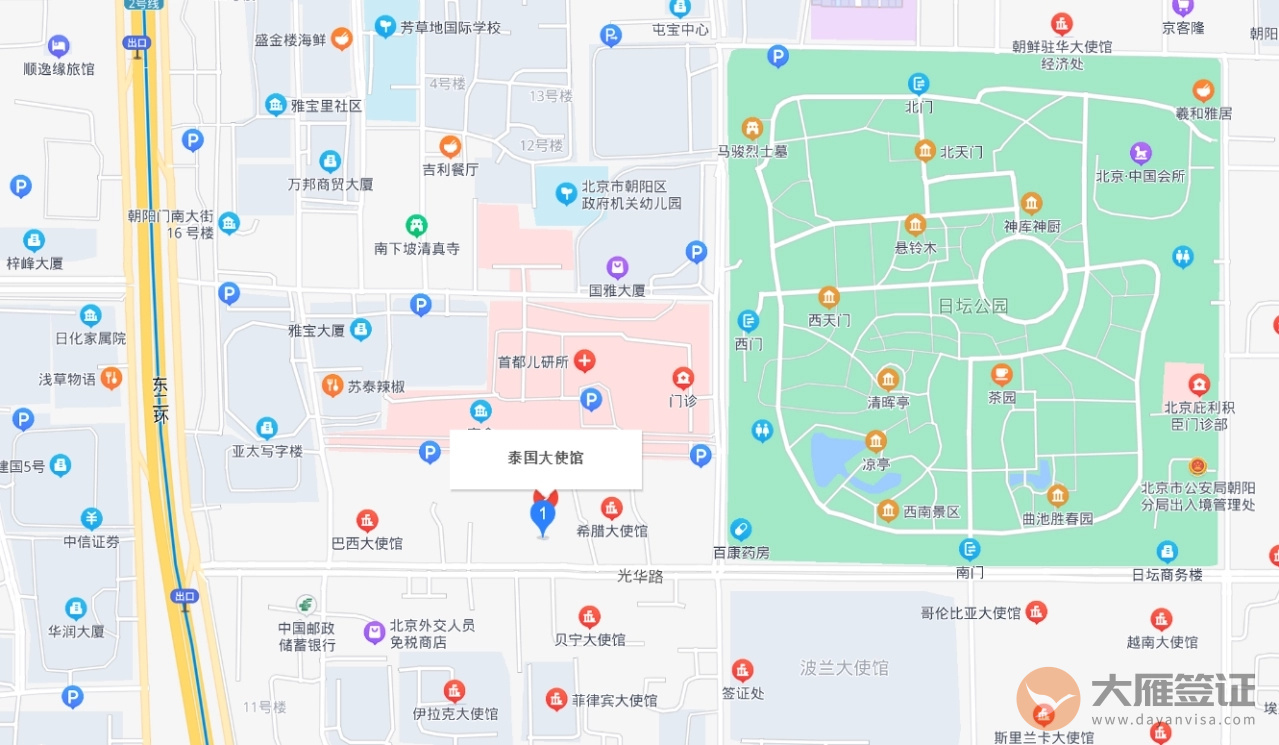 泰王国驻华大使馆在2017年2月3日已正式搬入新馆办公,位于光华路21号,旧大使馆的斜对面。签证处主要受理领事事务和签证申请,管辖区域为北京、天津、河北、湖北、河南、山西、黑龙江、吉林、辽宁、内蒙古、青海、新疆、西藏。